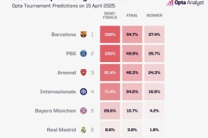 开云官网-Opta预测欧冠夺冠概率:巴萨27.4%最高&巴黎次席,皇马仅1.8%
